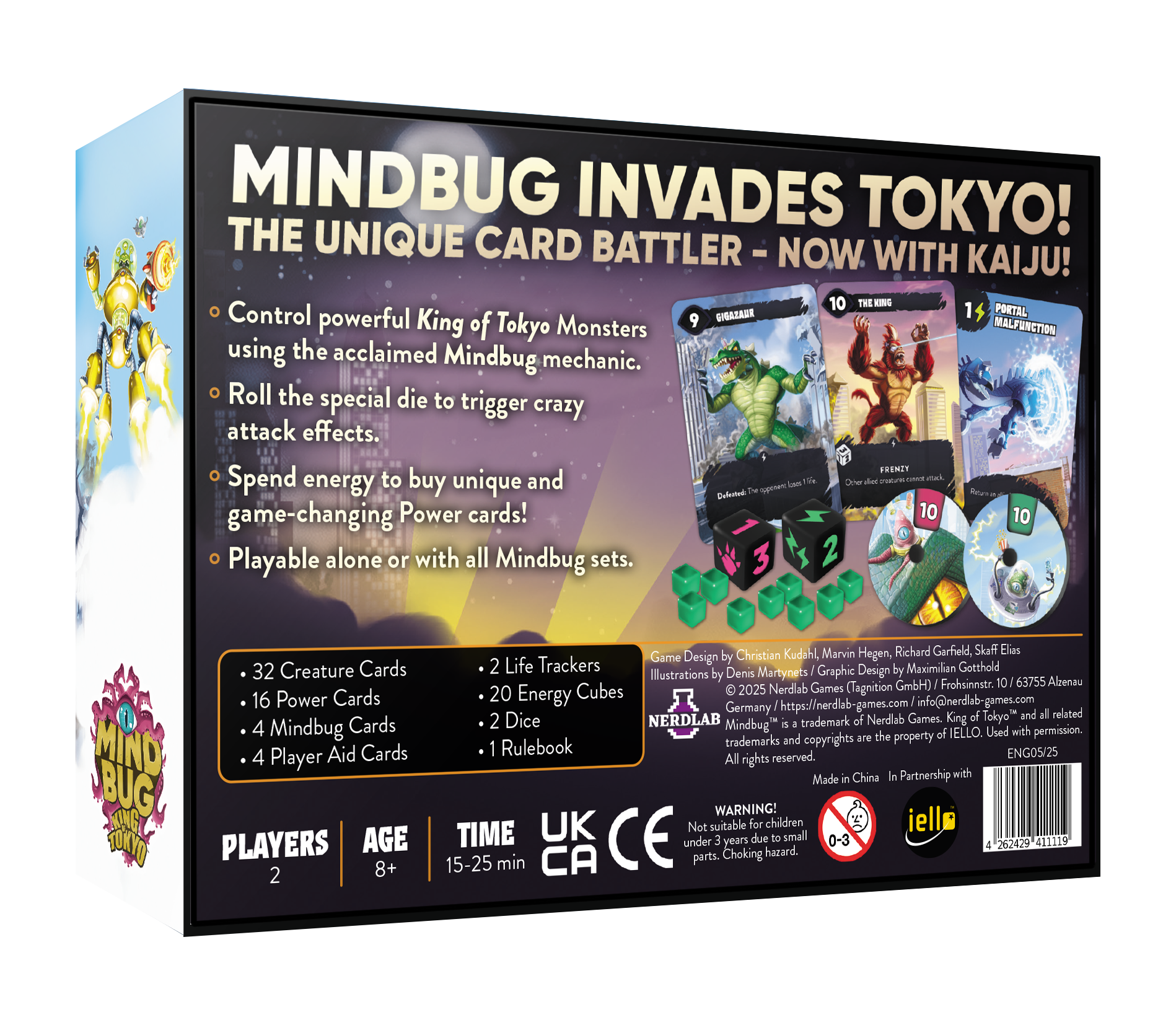 The ultimate crossover battle is here with a King of Tokyo-infused Mindbug experience. Through a mysterious portal, the Mindbugs have crossed over into Tokyo, encountering the legendary Kaijus and Monsters. However, this time you're in control.
