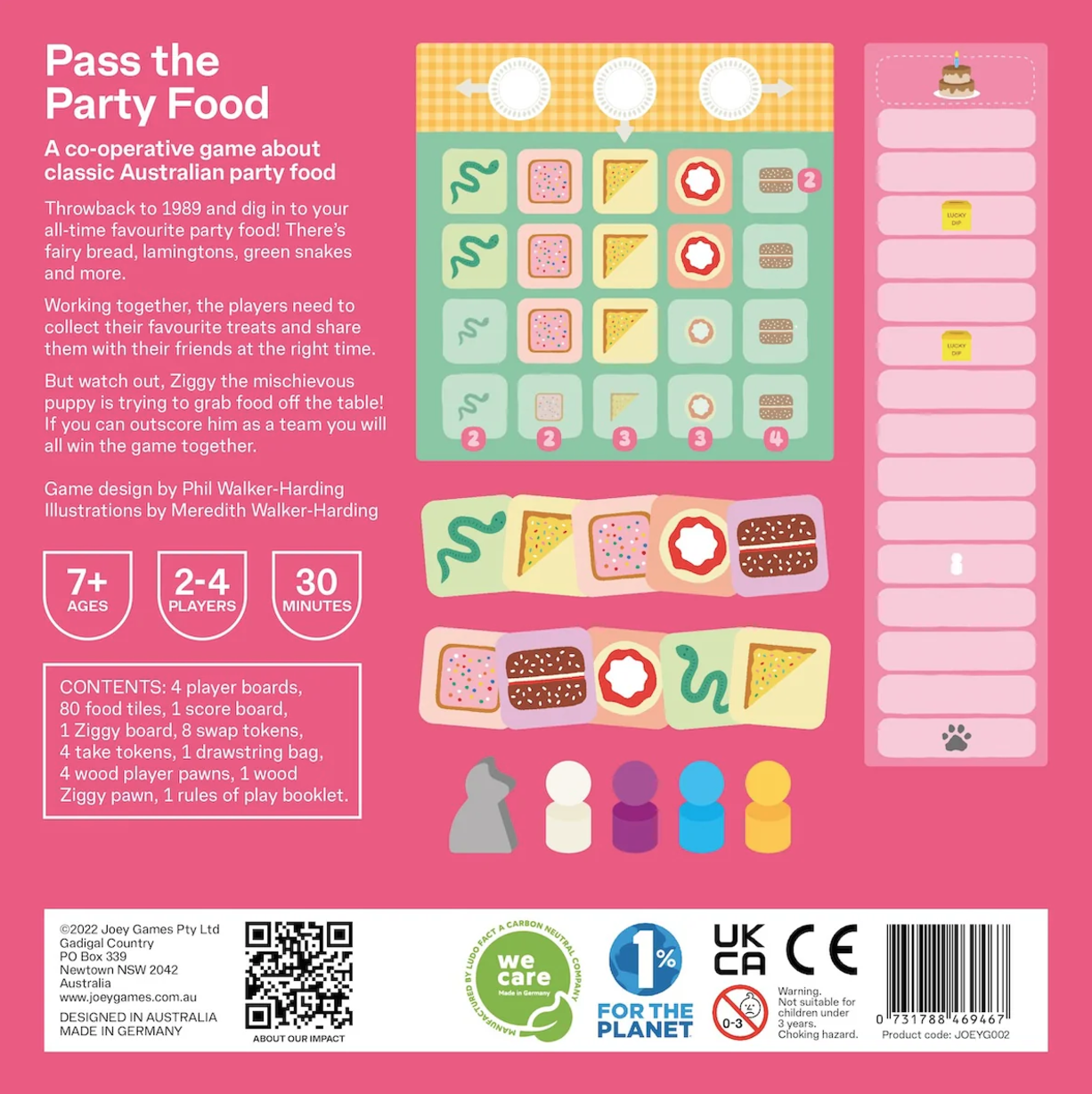 You're invited to an 80s kids party in Australia! You'll get to eat fairy bread, lamingtons, green snakes and more. Working together, the players need to collect their favourite treats and share them with their friends at the right time. But watch out, Ziggy the mischievous puppy is trying to grab food off the table! If you can outscore him as a team you will all win the game together. Pass the Party Food is a winner of the The Dice Tower Kid Approved Seal.