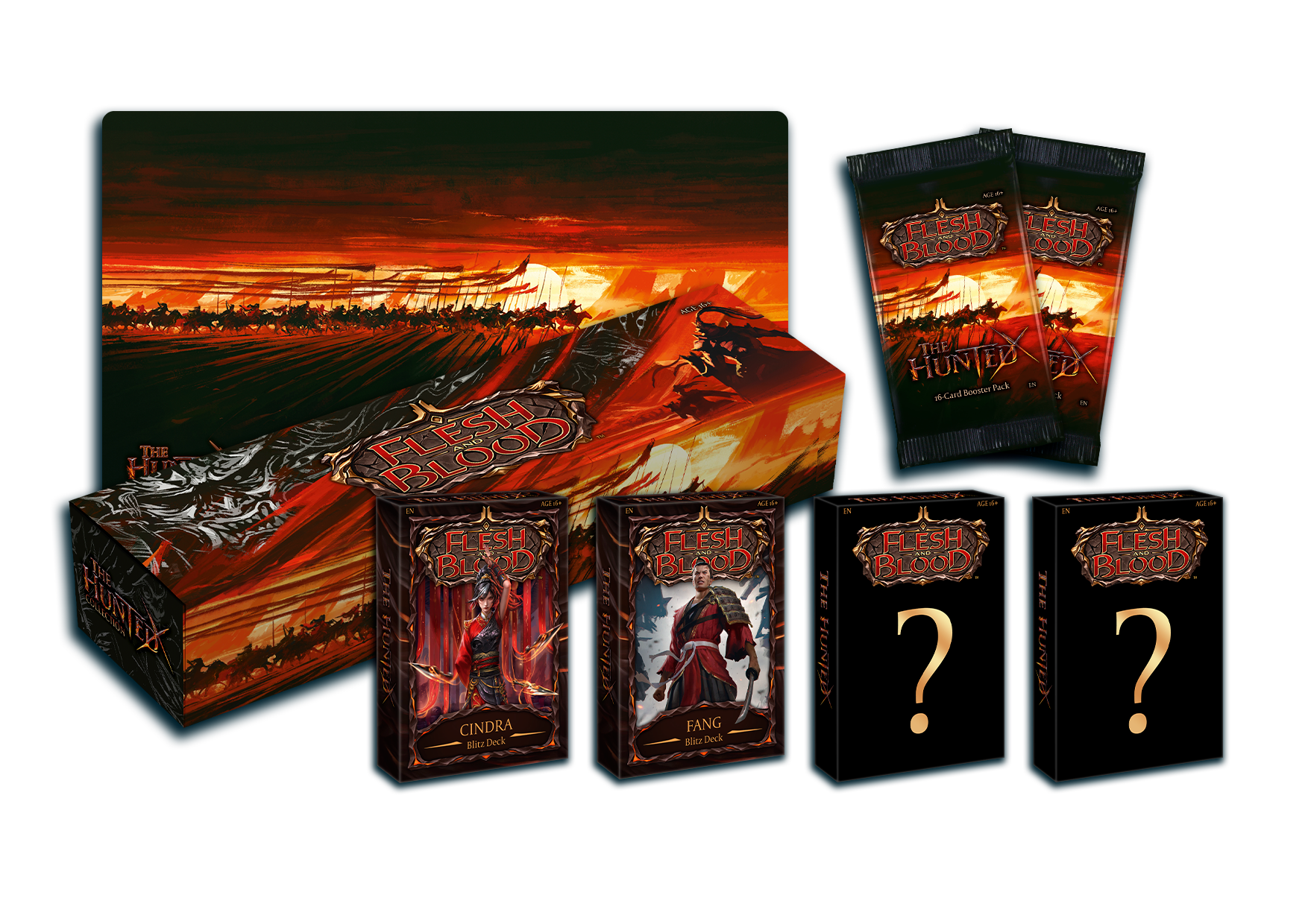 Each The Hunted Blitz Deck contains 40 cards, plus hero, weapon, equipment, and token cards, with each deck containing non-foil extended art cards exclusive to that deck. Each The Hunted booster pack contains 16 cards.