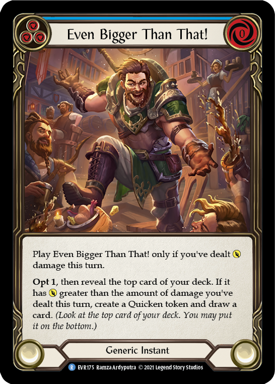 Play Even Bigger Than That! only if you've dealt [Power] this turn. Opt 1, then reveal the top card of your deck. If it has [Power] greater than the amount of damage you've dealt this turn, create a Quicken token and draw a card. (Look at the top card of your deck. You may put them on the bottom.)