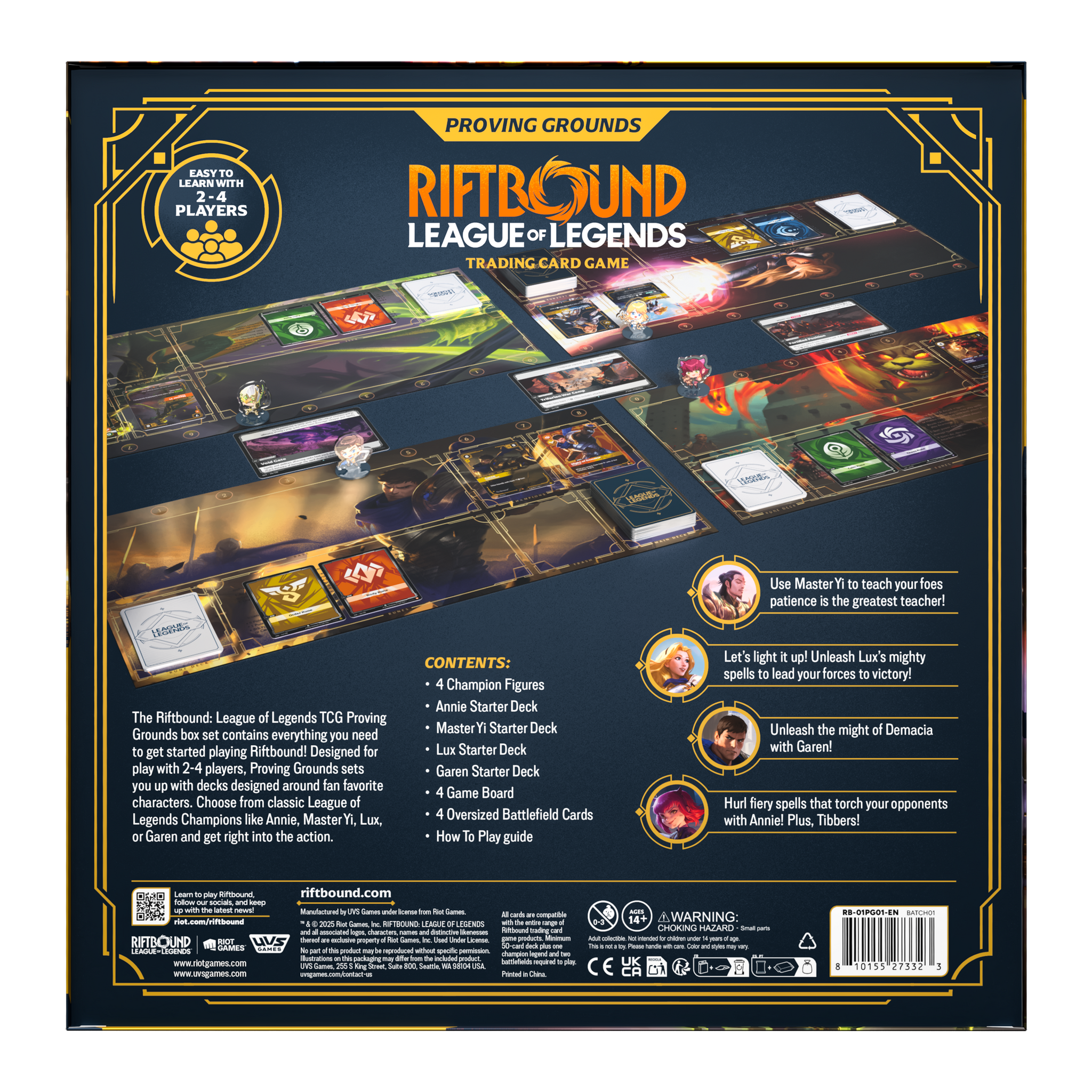 The Riftbound: League of Legends TCG Proving Grounds box set contains everything you need to get started playing Riftbound! Designed for play with 2-4 players, Proving Grounds sets you up with decks designed around fan favorite characters. Choose from classic League of Legends Champions Annie, Master Yi, Lux, or Garen and get right into the action.
