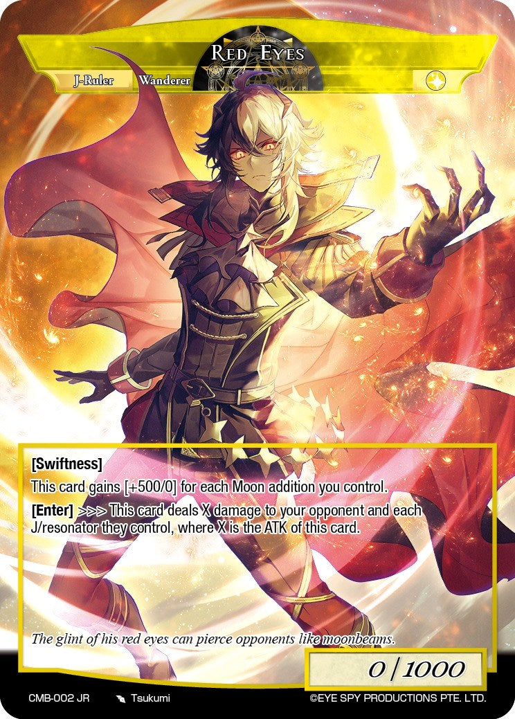 Draw a card. You may put a non-chant Moon with total cost 2 or less from your hand into the field. [Awakening] R: If you control a Moon entity, you may contract this card with "Aristella, Ascendant Prince of the Crimson Moon". Red Eyes [Swiftness] This card gains [+500/0] for each Moon addition you control. [Enter] This cards deals X damage to your opponent and each J/resonator they control, where X is the ATK of this card.