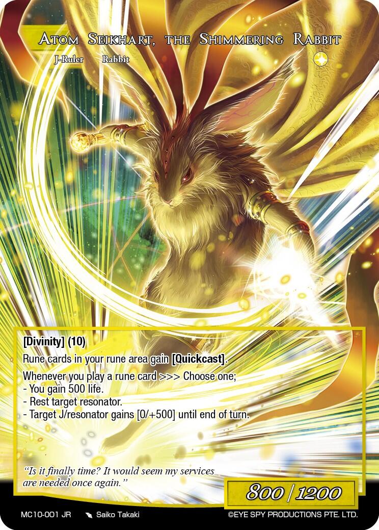 Hurry! Only0units left in stock!Set Name: Memoria Collection 10 Release Date: 2026-03-20 Rarity: Ruler Rare Card Type: Ruler [Divinity] (10) [Judgment] WW1 Atom Seikhart, The Shimmering Rabbit [Divinity] (10) Rune cards in your rune area gain [Quickcast]. Whenever you play a rune card >>> Choose one; - You gain 500 life. -Rest target resonator. - Target J/resonator gains [0/+500] until end of turn.Refund Policy